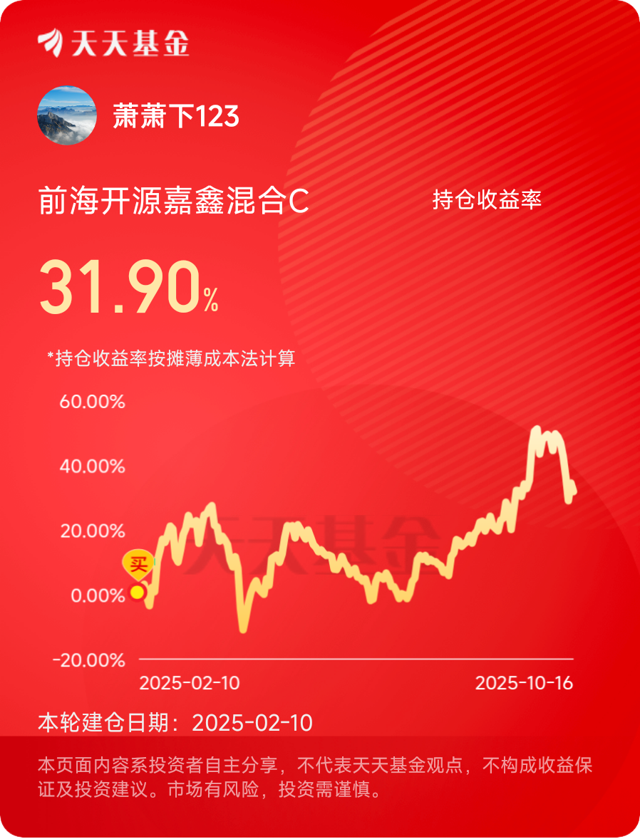 今年目前盈利4.7w,内心还是有点小爽的。基金真的比股票稳多了目前持仓还是以景气行业为主,市场风格并没有发生太大的变化,更多的机会还是集中在科技成长方向,整体还算比较满意吧。上半年满仓板块获得30%多的收益。展望2025年剩下一个季度交易日,我依然看好$前海开源嘉鑫混合C$的投资前景。 即使下跌应该也能保住一部分正收益。来吧,让暴风雨来的更猛烈些吧。