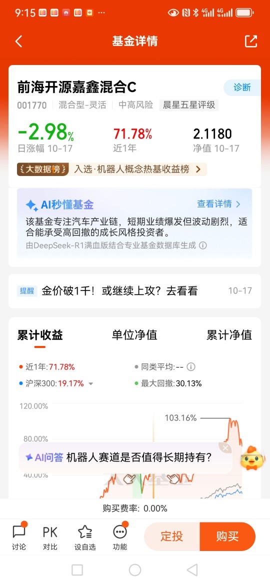 记得是今年夏天,$前海开源嘉鑫混合C$ 这个基金,想把它择机买到我的组合里面。