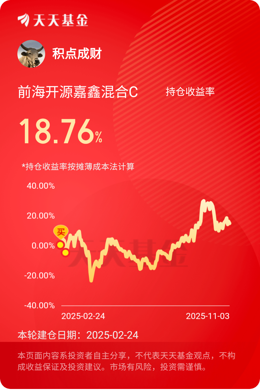科技兴国、大力发展新质生产力、中国制造走向世界是我国既定国策,科技是展现一个国家综合实力的有力表现,相信人工智能和机器人的飞跃发展,让中国科技在世界舞台上有了更多话语权。看好本基金赛道,看好吴基金的投研能力,我计划从本月开始开启周定投,长期持有$前海开源嘉鑫混合C(001770)$。@前海开源基金