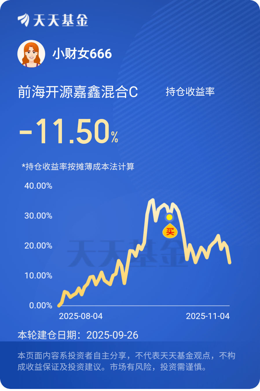 9月份以来,机器人赛道再次卷土重来,成为领涨板块。其中入选机器人概念热基收益榜单的$前海开源嘉鑫混合001770)$每天几个点几个点的上涨,让我错失几个亿的感觉,我便不顾一切,强行上车了!谁知这次真的是被晾在山顶了,我买之后就迎来了持续的调整,好在仓位不重,跌下来就是加仓的机会。