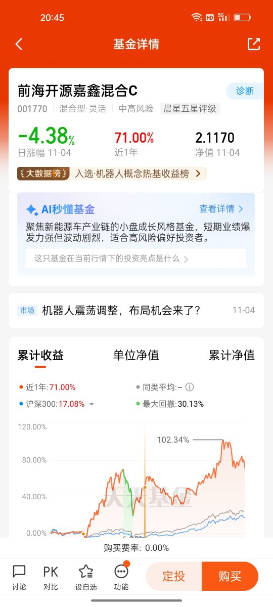 关注$前海开源嘉鑫混合C$ ,正是因为它精准踩中了这条主线。翻了基金的业绩数据,近1年71.00%、近5年92.80%、成立来164.47%的收益率,大幅跑赢沪深300指数70%+中证全债30%的业绩比较基准(近1年基准仅13.81%),这背后应该是基金在人形机器人产业链布局的兑现。