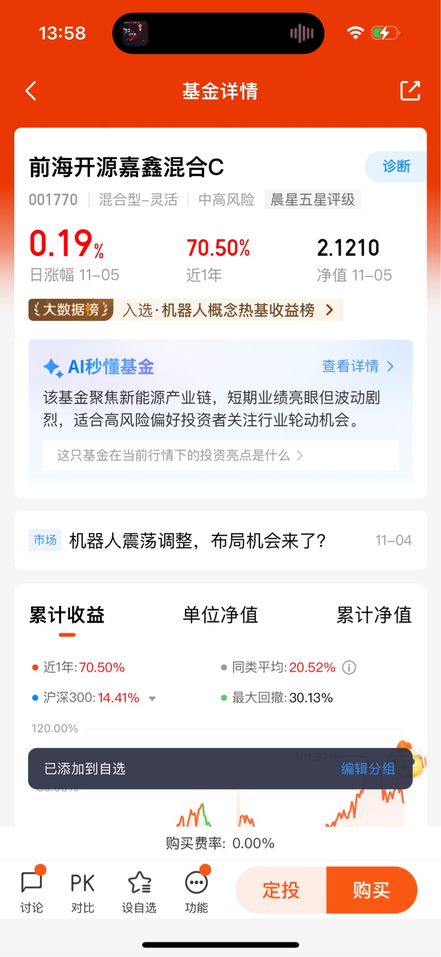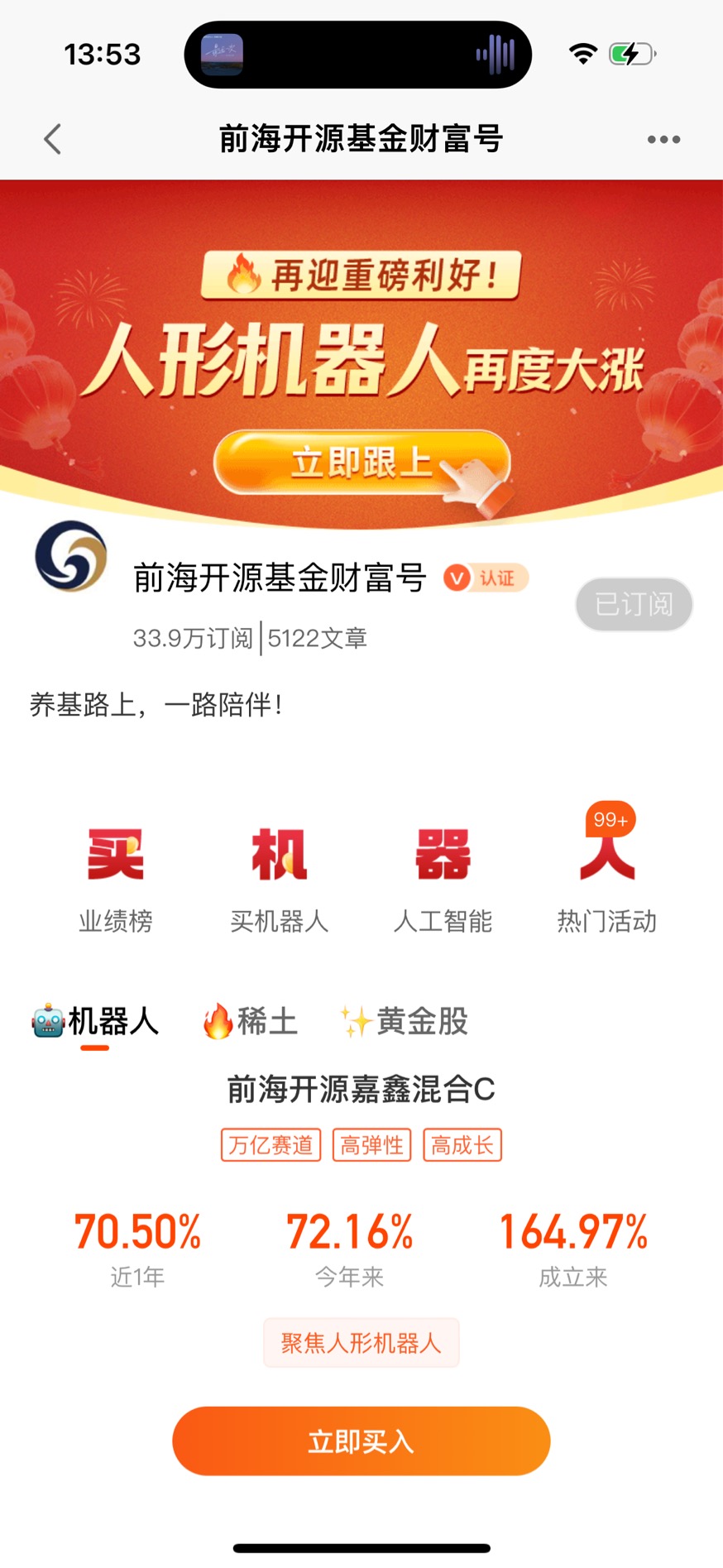 科技是第一生产力,一直比较关注科技行业的投资机会,其中尤其看好机器人产业,但是科技行业支线较多,我认为以主动基金的形式布局科技行业会更好,在科技产业加速迭代的背景下,$前海开源嘉鑫混合C$ 以高达+72.16%的年内收益,展现了其在科技赛道上的精准把握能力,我看好该基金的投资价值: