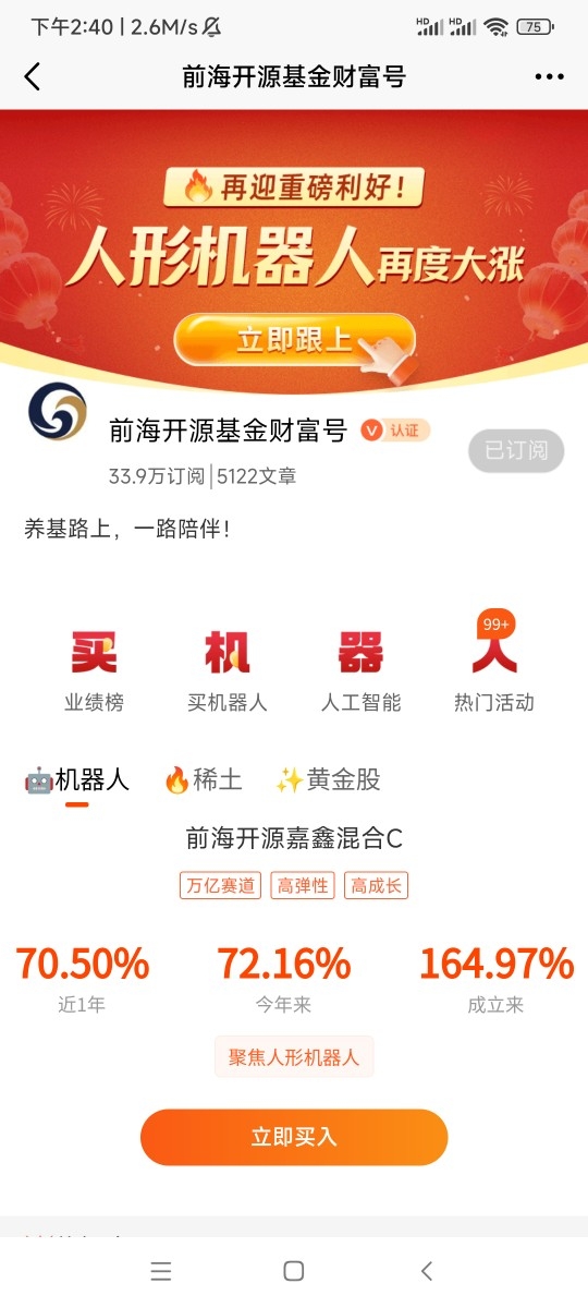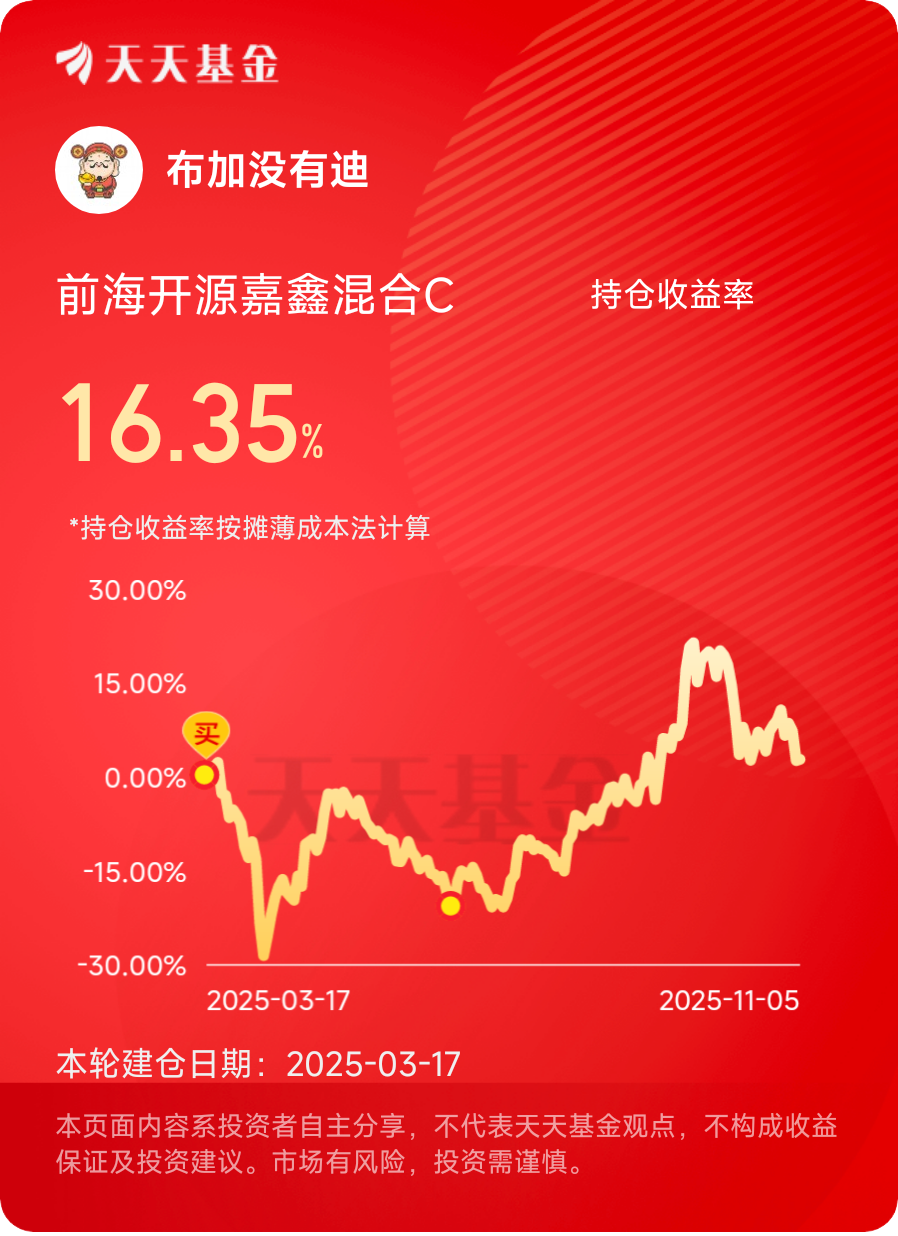 在我心中的前海开源基金“全家桶”里,$前海开源嘉鑫混合C$(001770)绝对是我的心头好!作为多次布局、反复加仓的老基民,这只平衡型混合基金的投资体验远超预期——不管是市场震荡时的稳健表现,还是近12个月70.50%的亮眼收益,都让我对它的投资价值深信不疑。它没有极端波动的焦虑,却总能用持续的正收益给出踏实反馈,每一次加仓都像是与靠谱伙伴的坚定同行。未来我会继续长期持有,逢低加仓不犹豫,稳稳跟着它分享市场成长的红利,这份信任与决心,从未动摇!@前海开源基金 #晒收益#