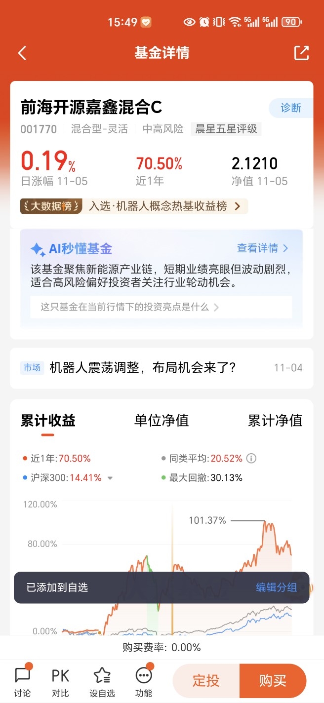 2. 精挑细选基金,锁定优质标的:2023年初,我开始筛选机器人主题基金,前后对比了二十多只后,敲定了华夏中证机器人ETF链接A和前海开源嘉鑫混合C两只基金。选华夏中证机器人ETF链接A,是因为它跟踪的指数涵盖汇川技术、埃斯顿等70家机器人龙头企业,能一键覆盖产业链核心,且费率比同类基金低30%,长期持有负担小 。而选前海开源嘉鑫混合C,是看中它不押注单一细分领域,持仓既有绿的谐波这类减速器龙头,也有工业和服务机器人相关标的,能通过均衡配置分散风险 。之后我各投了3万元,开启了基金投资之路。