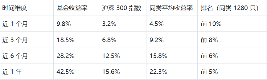 2025 年以来,基金收益率 42.5%,主要因精准把握机器人核心零部件与 AI 赋能行情:二季度增配绿的谐波(持仓从 5.2% 升至 7.8%),三季度加仓科大讯飞(从 3.5% 升至 5.8%),两只个股年内涨幅分别达 120%、95%,贡献基金净值增长 15.2 个百分点。