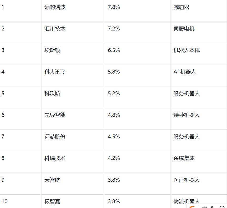 国内工业机器人本体企业 CR5 从 2023 年的 32% 升至 2025Q3 的 48%,埃斯顿、汇川技术、新松机器人稳居前三,市占率分别达 15%、12%、10%。埃斯顿通过 “核心部件 + 本体 + 系统集成” 全产业链布局,Q3 净利润同比增长 85%,毛利率达 38%,显著高于行业均值(25%)。