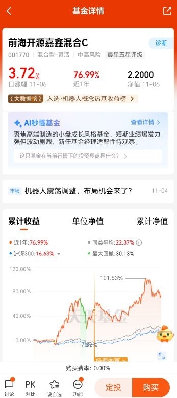 最近机器人板块真的太燃了!$前海开源嘉鑫混合C$ 近一年收益76.99%,把我看得心痒痒。虽然还没上车,但已经开始研究布局策略了。