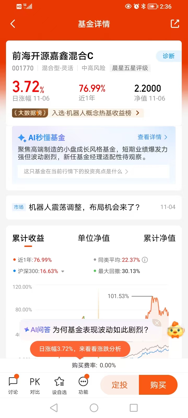 后来,我仔细研究了前海开源嘉鑫混合C的业绩和持仓,又关注了机器人行业的新闻,越看越觉得自己当初赎回太草率了。去年年底,我又重新买入了这只基金,这次我告诉自己,不管遇到什么波动,都要沉住气,长期持有。没想到,这一次我选对了,截至2025年11月7日,这只基金的最新净值已经涨到2.2000,11月6日单日就涨了3.72%,我投入的5万块钱,现在已经变成7万多了!
