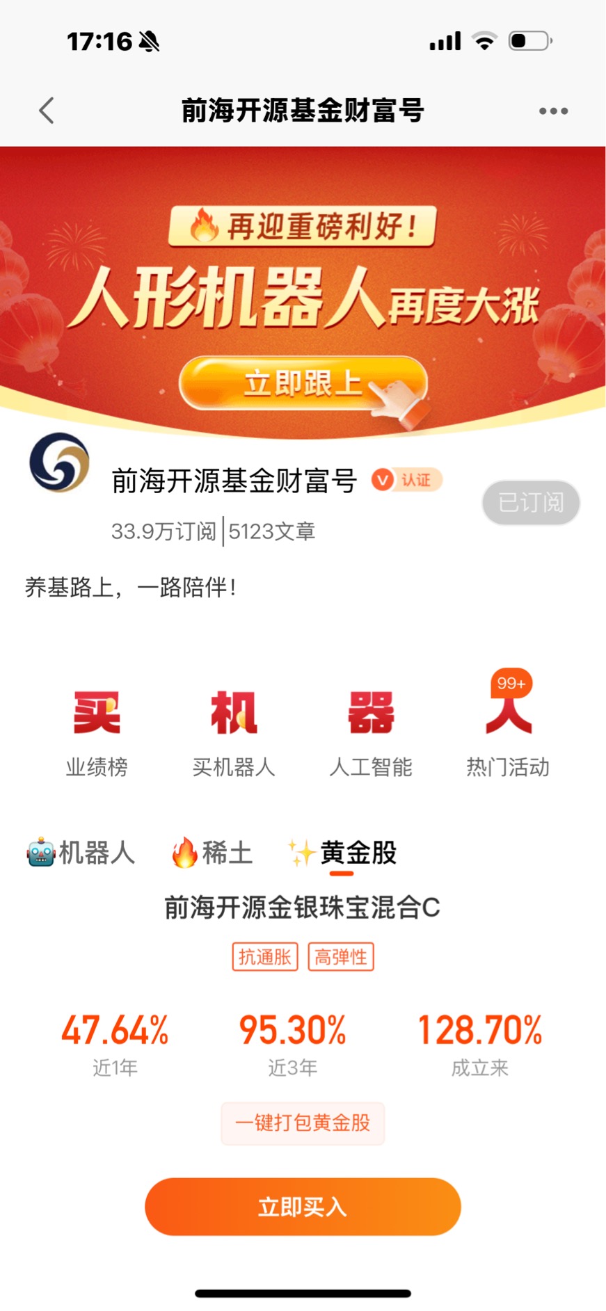 前海开源嘉鑫混合C(001770)凭借专业管理团队和出色业绩表现,对于看好机器人赛道的投资者来说,该基金将是一个不错的选择,坚持长期投资或定投方式参与,忽略短期波动,投资需要保持耐心和信心,分享行业发展的红利。@前海开源基金