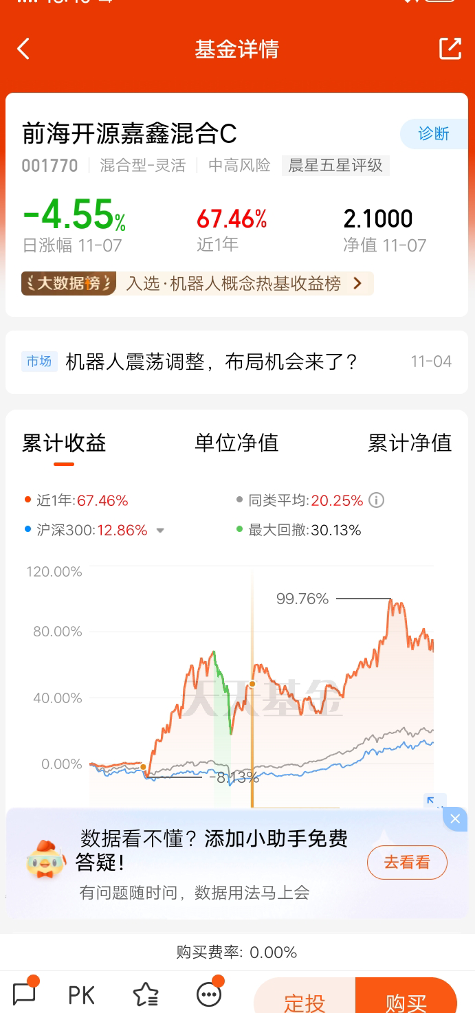 说起机器人赛道,我认为我错过了一些机会,今年以来,机器人赛道一直处于上涨中,我也一直没有买入。因为机器人赛道,我并不了解。我一直听信股神巴菲特的语录,不懂的赛道不要碰,巴老爷子也一直不碰科技股,但近些年,他也变通了,购买了具有科技属性的苹果公司,以及买过的比亚迪,这两家公司是科技兼具消费属性的,而其实机器人赛道也是科技兼消费属性的,我认为我也应该考虑配置一部分机器人相关领域的公司,可能是一个不错的选择。$前海开源嘉鑫混合C$ @前海开源基金