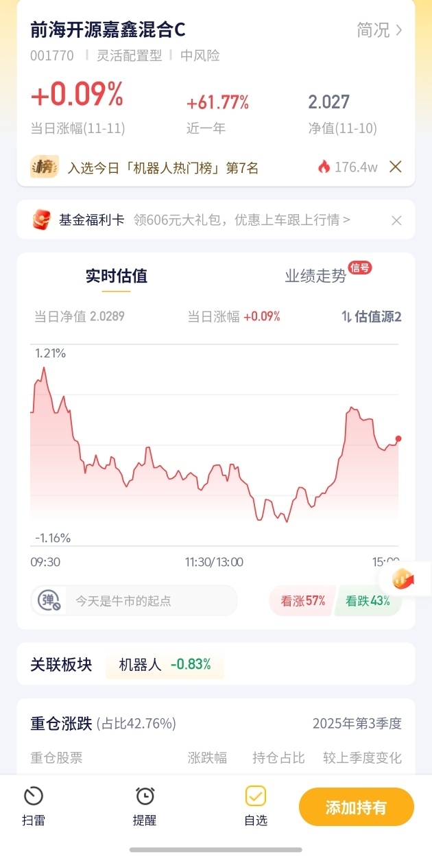 1. 【前海开源嘉鑫混合C估值播报+11.11行情】前海开源嘉鑫混合C今日预估涨幅+0.09%!在多数下跌的自选里逆势微涨,稳中有进。