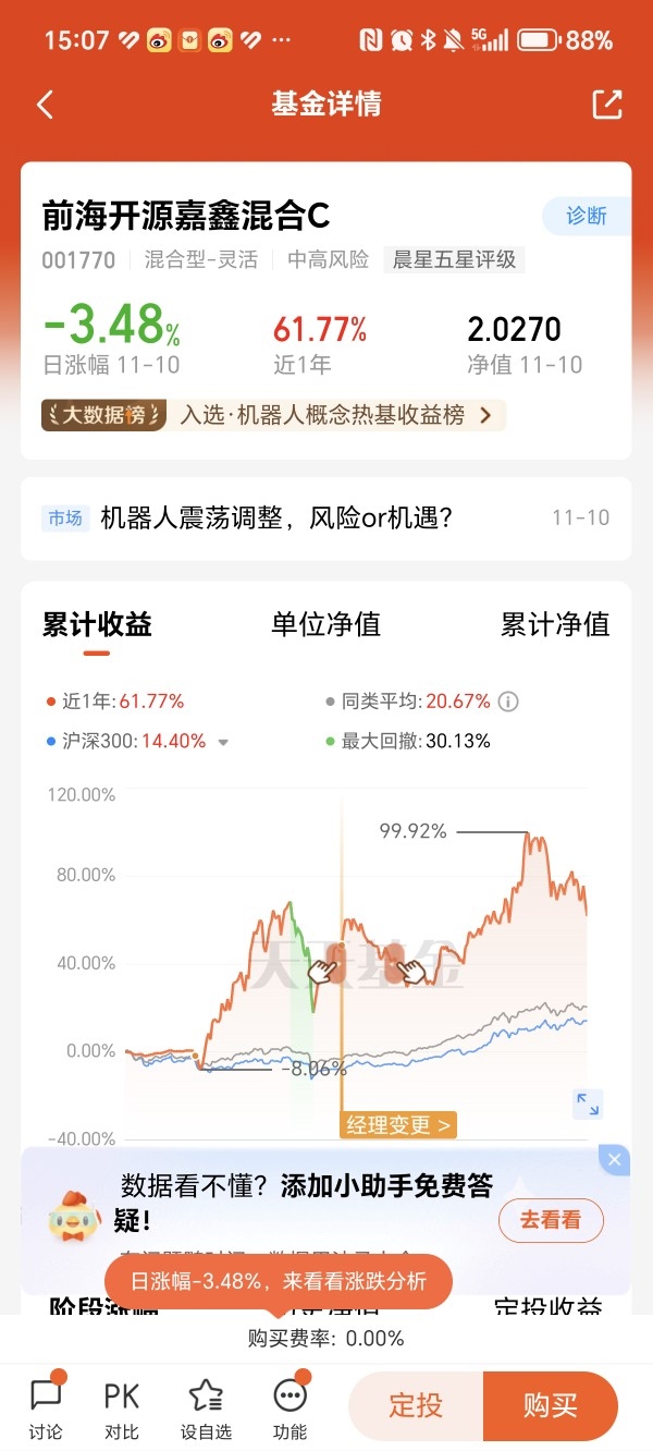 在投资基金的过程中,我发现了一个“小秘密”:小规模基金往往能带来更高的弹性收益——而前海开源盛鑫混合C,就是我挖到的“宝藏小规模基金”。盛鑫混合C聚焦机器人赛道,规模不大,这让基金经理在调仓换股时更灵活,能快速捕捉机器人行业的细分机会。比如今年机器人板块波动较大,但盛鑫凭借精准的持仓调整,不仅快速反弹,还跑赢了不少同赛道的大规模基金。