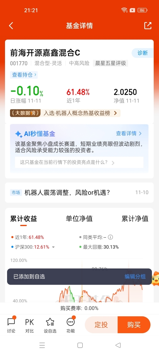 $前海开源嘉鑫混合C$ (001770)作为平衡型基金,兼顾债券与股票配置的灵活性,其持仓中隐含的高端制造相关标的,为捕捉机器人板块红利预留了空间。该基金最新净值2.0250,近12个月涨幅达61.77%,长期收益表现亮眼,且C类份额免申购费,适配中小投资者灵活布局。