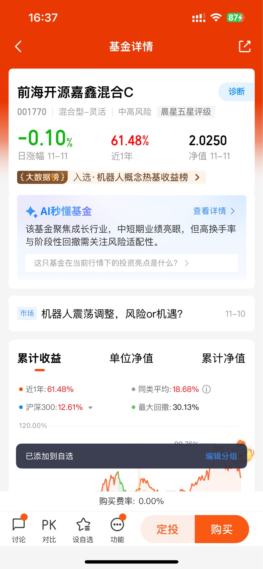 我一直以来都十分看好机器人赛道的投资潜力,机器人产业的发展速度非常快,技术不断更迭,各种新型人形机器人层出不穷,人形机器人板块的机会非常多!但是我就是一直没有加仓机器人相关基金,看到$前海开源嘉鑫混合C$ 过去一年涨的这么多,真是懊悔自己没有加仓。。