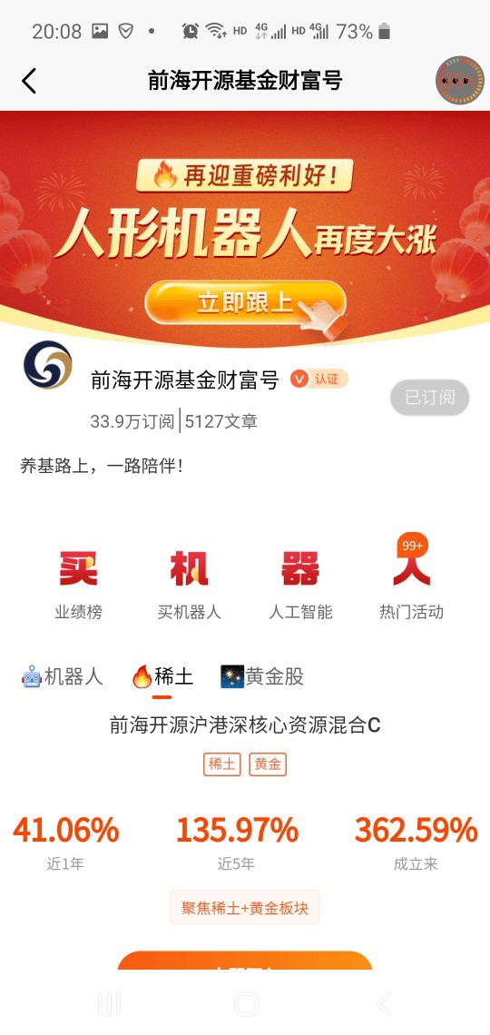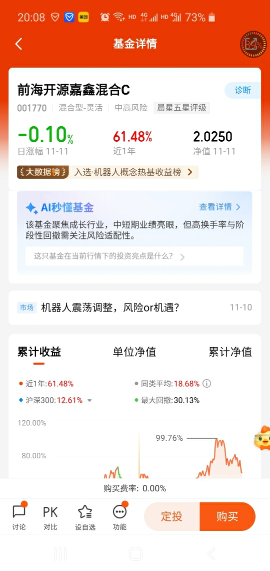 一键布局机器人赛道,就选$前海开源嘉鑫混合001770)$。本基金近一年涨幅一度超过100%,入选机器人概念热基收益榜。近期迎来了深度调整,给没有上车机器人赛道的朋友,投资了良好
