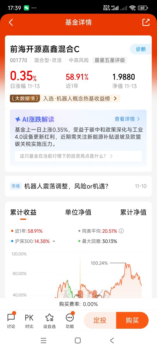 【前海开源嘉鑫混合C 001770】昨天上涨了0.35%,今天重仓股大部分回落,近一年涨幅仍然有58%,趁低位建仓,长期持有也是很不错选择。