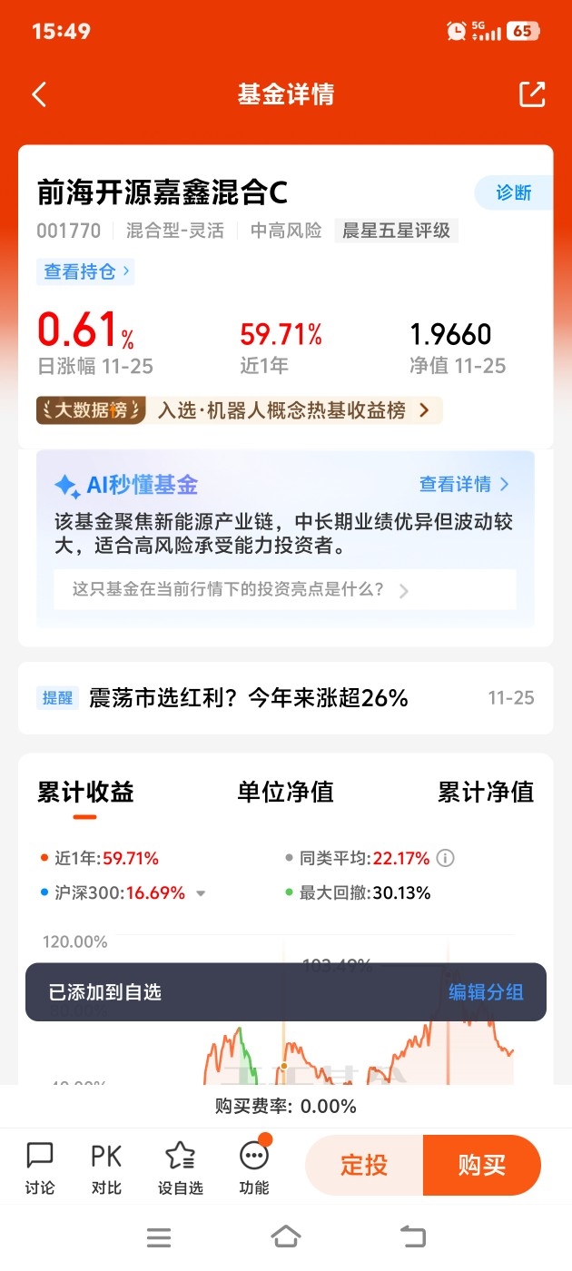 作为一只灵活配置混合型基金,前海开源嘉鑫混合C的核心优势在于“攻守平衡”。基金经理团队采用“固收+科技成长”的组合策略,债券仓位以高等级信用债为主构建安全垫,股票仓位则精准卡位机器人产业链。2024年四季度,基金果断将股票仓位从不足30%提升至80%以上,集中布局核心零部件、智能控制等关键环节,完美踩中板块爆发起点。截至2025年三季度,该基金年内收益率稳居同类前2%,最大回撤不足9%,在板块剧烈波动中展现出极强的抗压韧性,这种“进可攻退可守”的特性,正是其吸引我的核心原因。