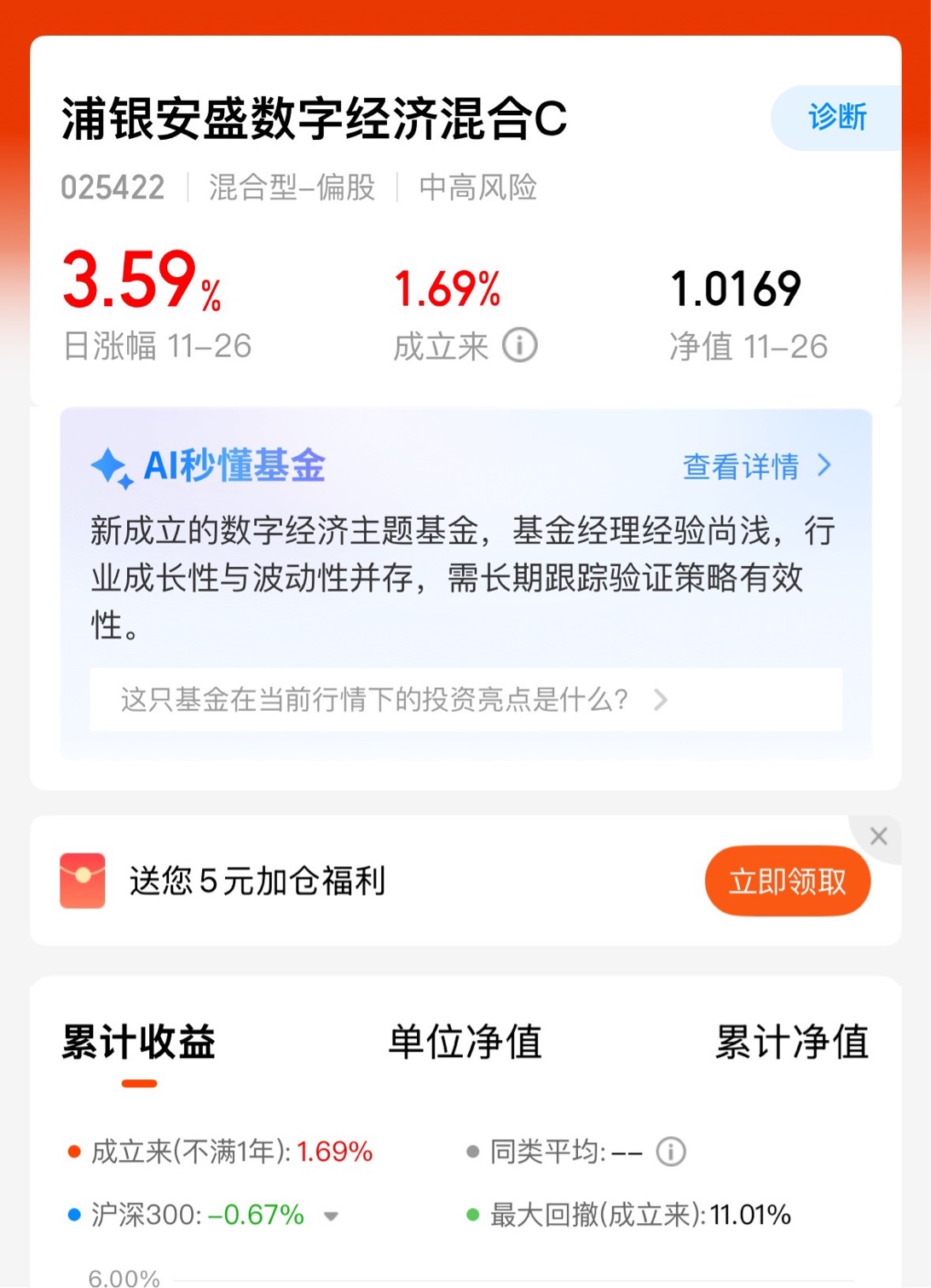 $浦银安盛数字经济混合C$今天单日大涨3.59%!CPO还是得选主动基,新成立的