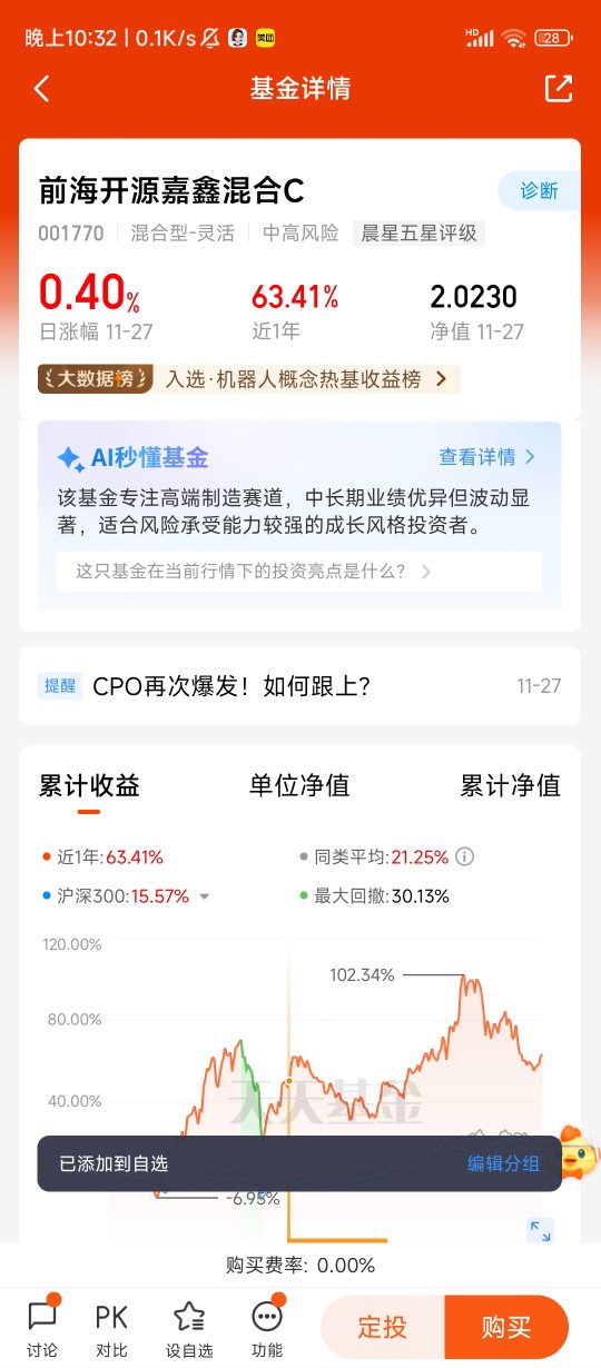 去年春天,智能投顾根据我的中风险偏好和3年投资周期,在推荐组合里重点标注了前海开源嘉鑫混合C。深入了解后发现,这只“小而美”基金正酝酿策略转型——新上任的基金经理吴国清是17年从业经验的“周期成长猎手”,计划聚焦机器人产业链布局,而当时人形机器人量产传闻初起,正是布局好时机。更打动我的是它的风控实力,近一年最大回撤仅8.9%,夏普比率超越99.32%同类产品,完全契合我“稳健求进”的需求,于是果断将其纳入核心持仓,开启每月定投500元的节奏。