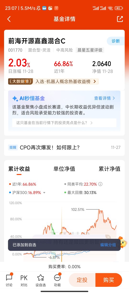 在投资前海开源嘉鑫混合C的过程中,我采用了“定投+动态调整”的策略。我设置了每周四的定投计划,无论市场涨跌,都坚持买入,以此摊薄成本。同时,我也会根据市场走势和基金表现进行动态调整。例如,在机器人板块回调时,我会适当增加仓位;而在市场过热时,我会选择部分止盈,锁定利润。这种策略让我在市场波动中保持了冷静,也收获了不错的收益。