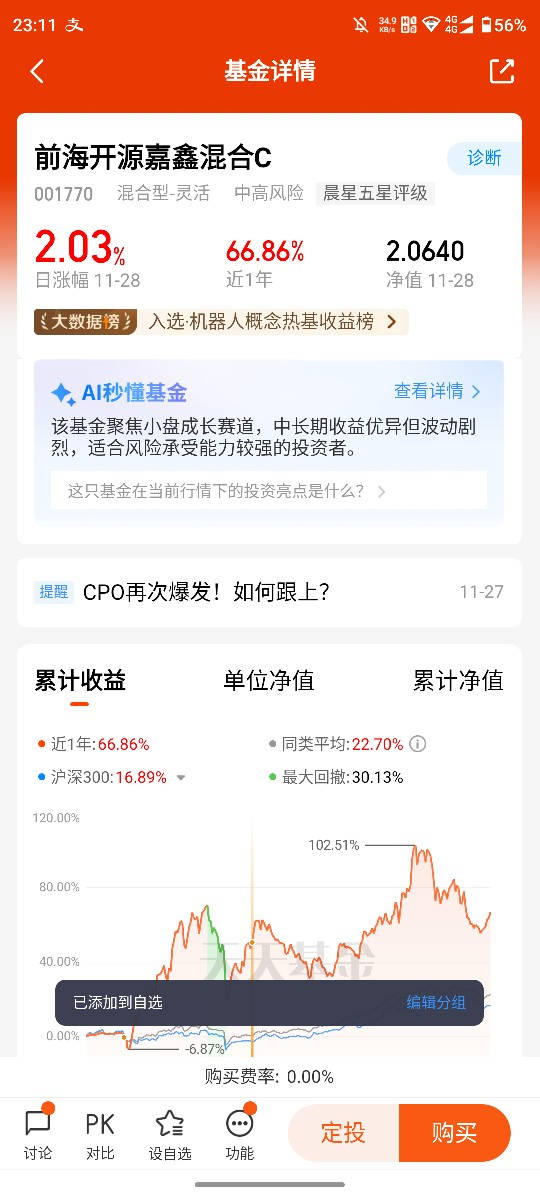 作为普通投资者,我没什么复杂的技巧,选基金只认两点:赛道有前景、基金能扛事,前海开源嘉鑫混合C就是我踩准机器人风口的关键选择,从买入到加仓再到长期持有,每一步操作都靠实打实的观察和判断,至今已经拿到了超20%的收益,这份经历想好好跟大家唠唠。
