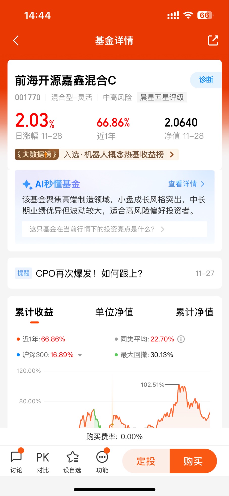 最初关注这只基金,是因为偶然看到它的持仓里重仓了不少机器人产业链标的。当时市场上聊AI的多、谈机器人的少,我却觉得人形机器人作为“未来生产力”,成长逻辑足够硬核。抱着试试看的心态,我先小仓位入手了嘉鑫混合C,没想到很快就迎来了惊喜——建仓后没多久,机器人关节减速器、伺服电机等细分领域就迎来政策利好,基金净值跟着水涨船高,短短一个月就有了不错的浮盈。