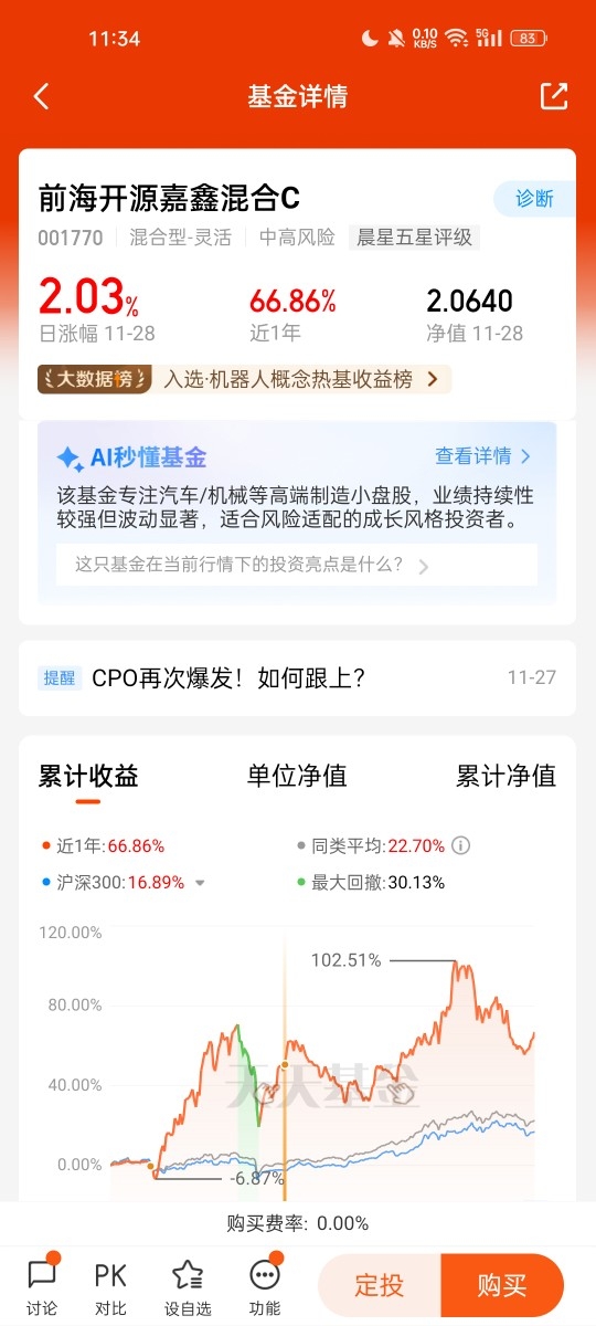 投资过程中,我也经历了市场的波动。年初买入后,基金曾出现大幅回调,账户一度亏损。但我坚信自己的判断,决定在回调时果断补仓,分批加仓摊薄成本。这一操作成为转折点,基金随后企稳回升,最终实现了可观的收益。前海开源嘉鑫混合C在机器人赛道的精准布局,以及其出色的业绩表现,让我对其未来充满期待。@前海开源基金