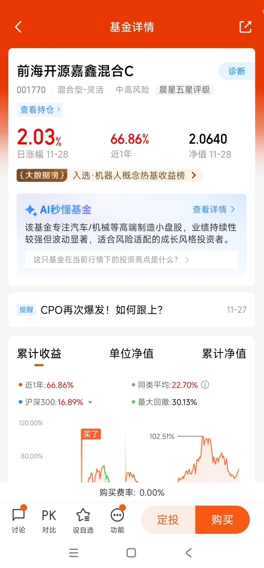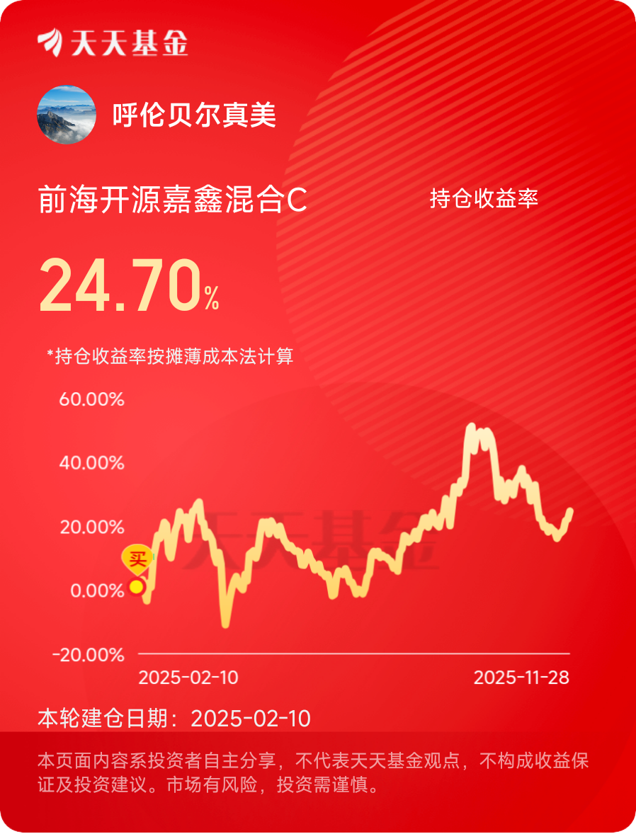 今年目前盈利6.5w,内心还是有点小爽的。基金真的比股票稳多了目前持仓还是以景气行业为主,市场风格并没有发生太大的变化,更多的机会还是集中在科技成长方向,整体还算比较满意吧。目前满仓板块获得30%多的收益。展望2025年剩下一个季度交易日,我依然看好$前海开源嘉鑫混合C$ 的投资前景。 即使下跌应该也能保住一部分正收益。来吧,让暴风雨来的更猛烈些吧。