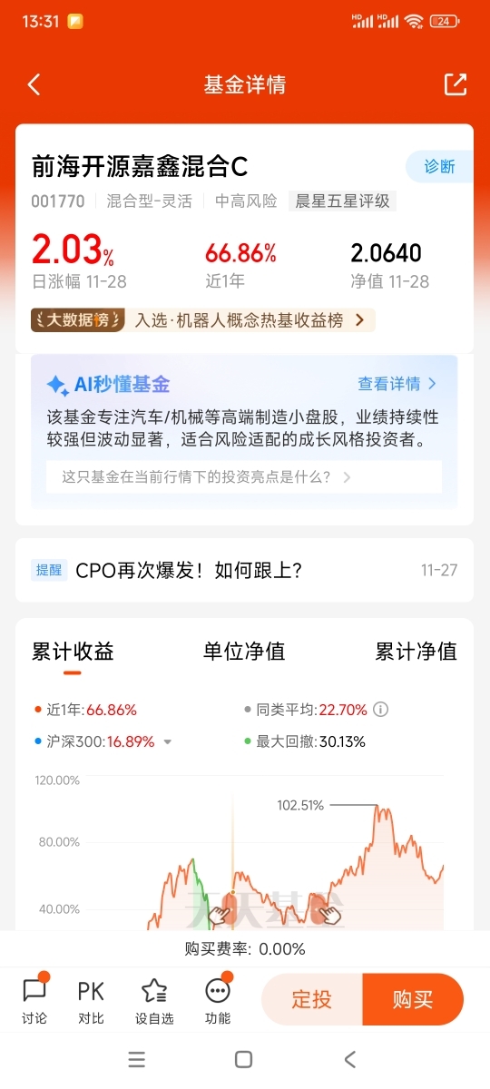 去年因为看好机器人行业的前景,所以重仓了这个板块,刚一买就面临回调,当时应该是阶段高点。我当时也很头铁,取出一笔存款,不断在底部补仓,试图不断降低持仓价格。后面机器人行情来了,整整赚了30%多的收益。太开心了,认准了就要坚持,千万不能半途而废,这是我这次投资的经验。