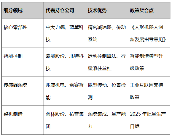 作为“核心”部分的补充,应配置宽基指数基金或均衡型主动管理基金,以获取市场平均收益并分散单一行业风险。前海开源嘉鑫混合C基金则作为“卫星”,专注于冲击超额收益。其投资逻辑紧密围绕机器人产业链的国产替代主线,重仓标的如蓝黛科技(传动系统)、中大力德(精密减速器)、双林股份(丝杠)等均为核心环节企业,与2025年核心零部件国产化率需达75%的政策目标高度契合,增强了其策略的长期合理性。