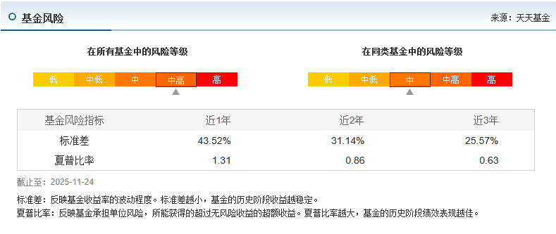 波动率:近1年标准差43.52%,高于同类平均,但夏普比率1.31优于同类多数。