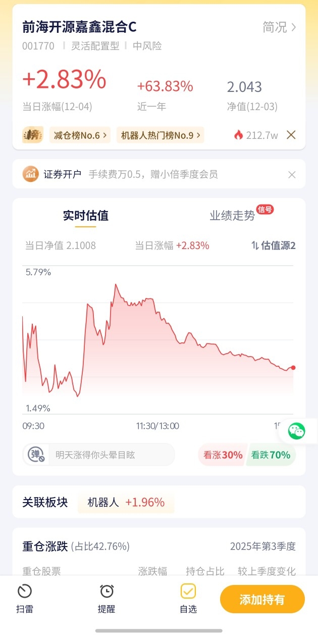 我持有的前海开源嘉鑫混合C今日预估上涨2.83%