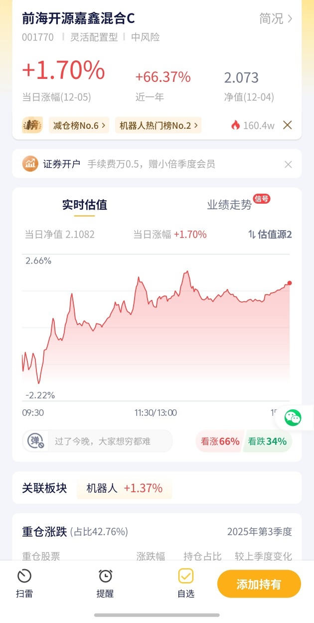 前海开源嘉鑫混合C今日预估涨幅1.70%!在自选基金中涨幅居首,表现突出