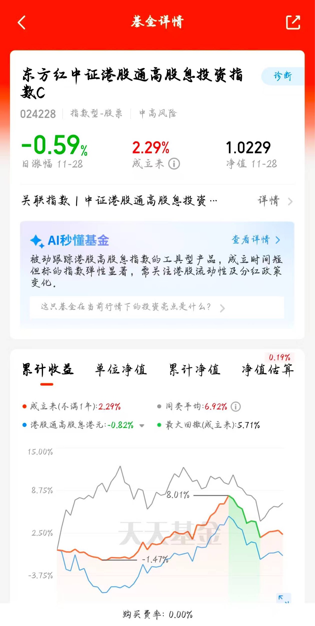 简单投资选东方红中证港股通高股息投资指数C,指数化投资高息股不折腾,近一周涨近0.5%成立来收益2.29%,0手续费买卖灵活。