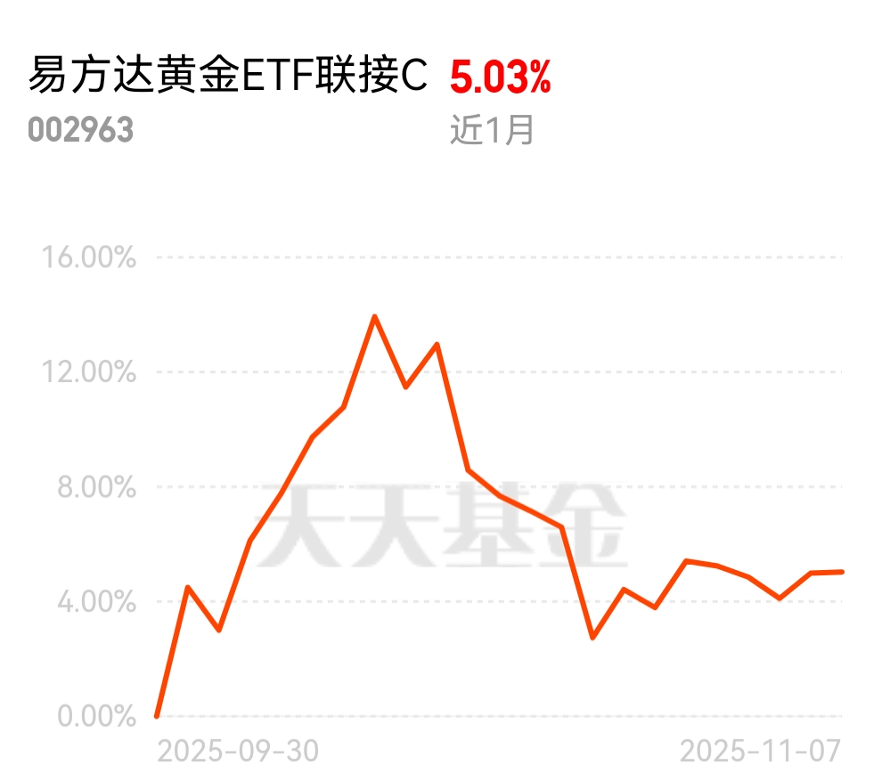 现在市场上的投资产品五花八门,但靠谱的不多,黄金作为千年硬通货一直让人放心。易方达黄金ETF联接C近1个月涨了5.03%,紧密跟踪黄金价格走势,费用透明低廉,没有隐性支出,想稳健赚钱的可以了解下。