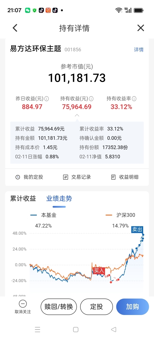 $易方达环保主题混合A$经理非常牛!但是没有永远上涨的基金,正在小步的逐步的减点