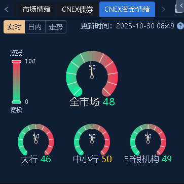 DR001报1.30%左右,DR007报1.47%左右,资金情绪均衡偏松(CNEX资金面情绪指数在48)