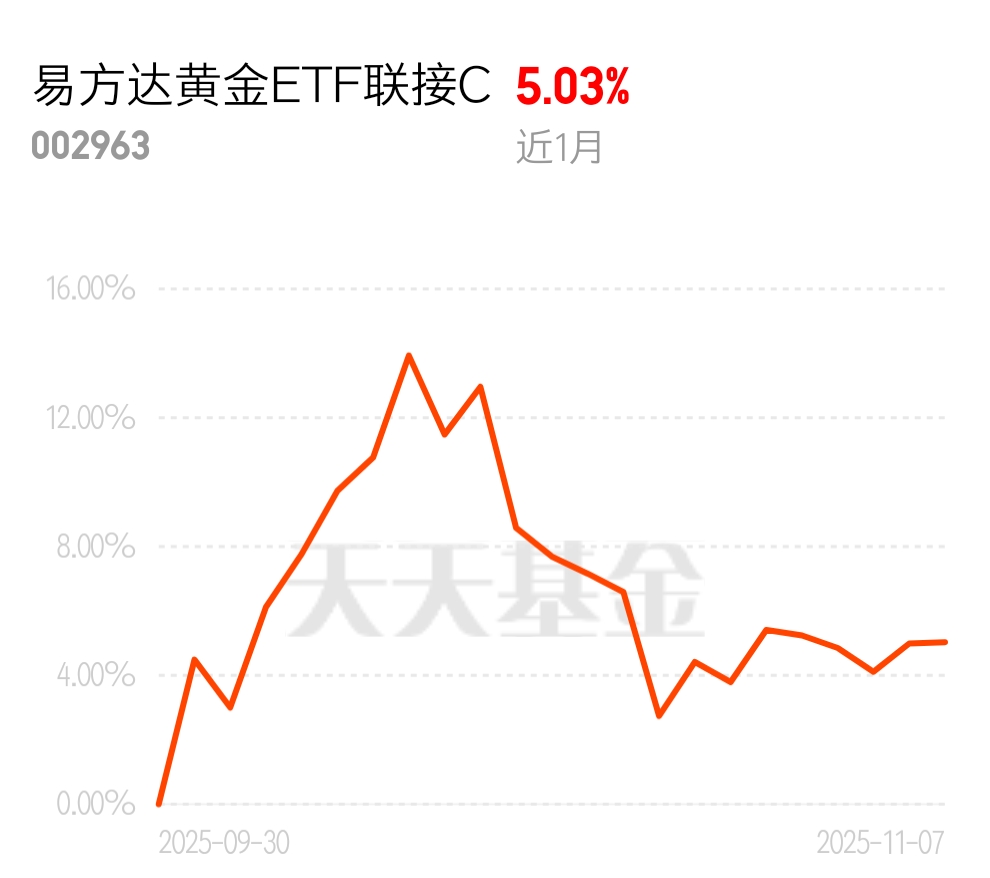 最近黄金相关的投资产品都很火爆,不管是新手还是老投资者,都在关注黄金市场的机会。易方达黄金ETF联接C近1个月涨了5.03%,操作简单,在手机上就能买卖,不用跑线下,随时随地参与黄金投资。 $易方达黄金ETF联接C$