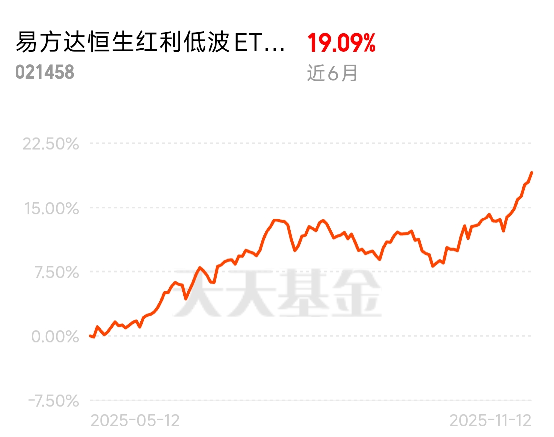年末市场博弈加剧,稳健型资产成了香饽饽,港股红利低波板块因为业绩稳、分红高备受关注。易方达恒生红利低波联接C近6个月涨了19.09%,费率远低于同类的富国、摩根、天弘相关产品,低费率布局港股红利超划算。
