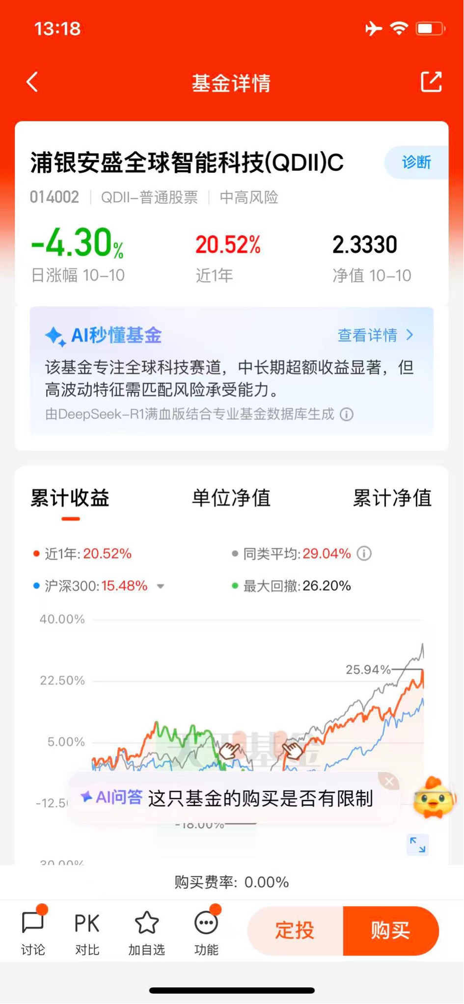 $浦银安盛全球智能科技(QDII)C$ 完全不限购,牛市看仓位,想要补足仓位的来