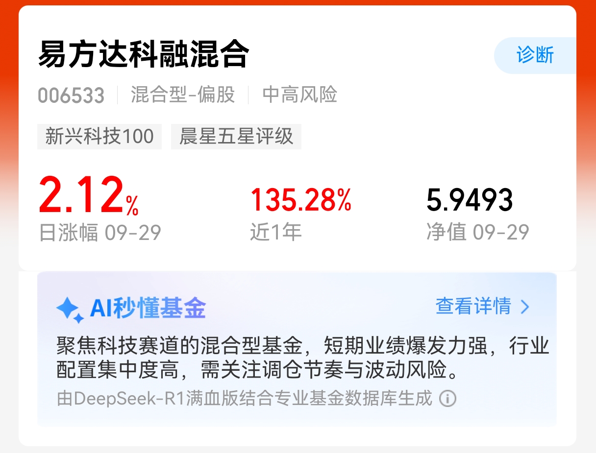 科技还是值得期待,不过押注单一科技赛道风险也是比较大,回撤风险高,而$易方达科融混合(OTCFUND|006533)$表现还是很出色的,整体来看业绩优秀,近一个月涨幅12.52%,近三个月涨幅80.97%,近一年涨幅135.28%,涨超100%,不仅买了科技,还买了反内卷相关的新能源相关的,事实证明,经理眼光真的是很好。