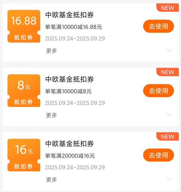 今天还在中欧基金的详情页领到了不少的卡券,领了冲更划算,我今天买进5w的筹码。
