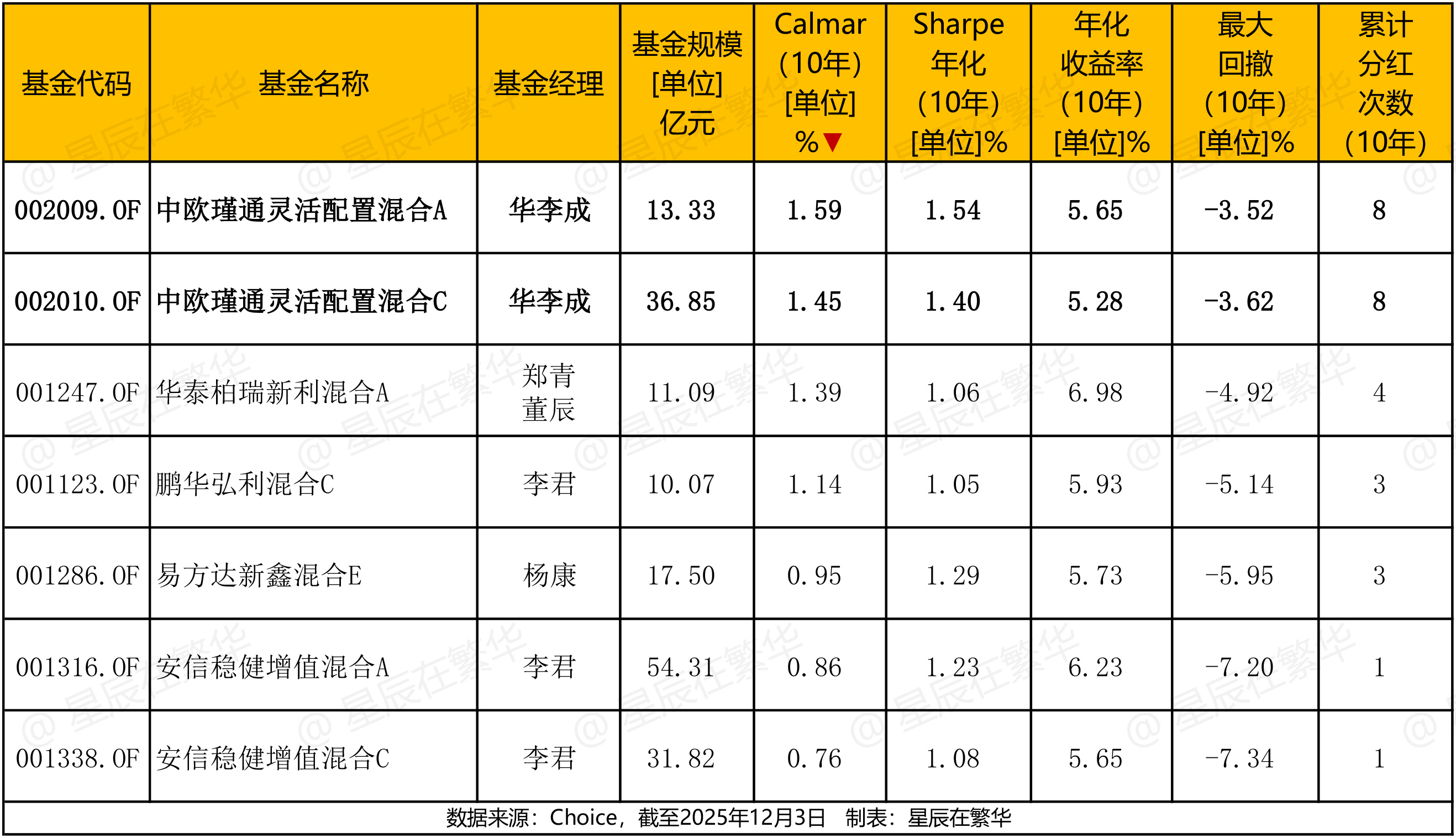 因此,我们继续用夏普比率(Sharpe)年化(10年维度)来辅助判断基金经理在平衡收益和日常波动方面的管理能力,筛选出来排在首位同样也是:中欧瑾通灵活配置混合(A类:002009,C类:002010)。