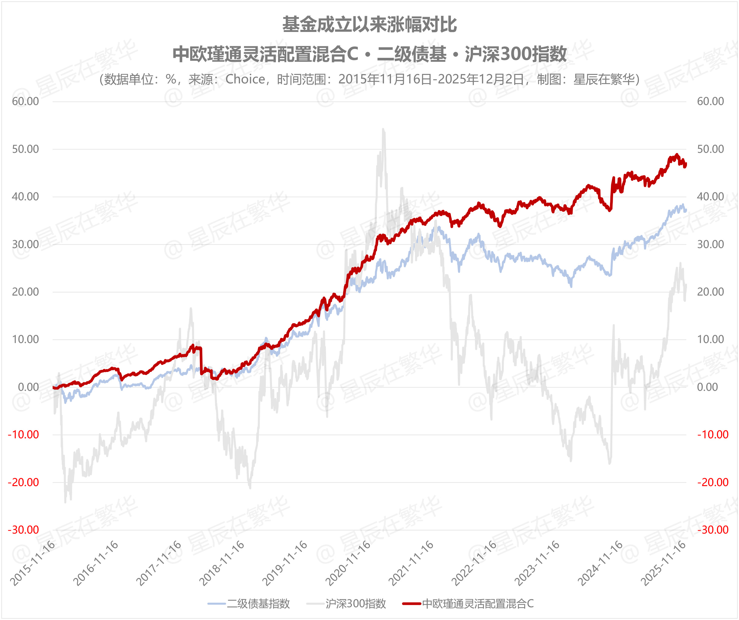 从持有体验上讲,相比沪深300的剧烈波动获得的阶段性收益,灵活配置型的“固收”+基金(以“中欧瑾通灵活配置混合C”为例)收益曲线稳步向上。截至今年12月2日,该基金10年累计涨幅达46.85%。