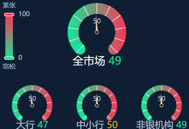 六、资金面情绪指数:全市场49 资金面维稳 (0-100紧张度递增,50为均衡,超过50反映资金紧张)