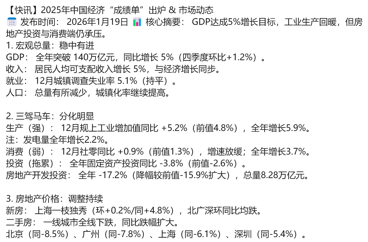 今天上午我国公布了多个重要经济数据,全年GDP、固定资产投资率、规模以上工业增加值到城镇失业率(详见末尾)。总体看是符合预期的,除开顺利完成GDP全年5%增长外,一方面固定资产投资或者简单理解房地产仍未反弹,社会零售虽12月跌幅收窄但全年比预期弱,这些和大多数人体感一致。
