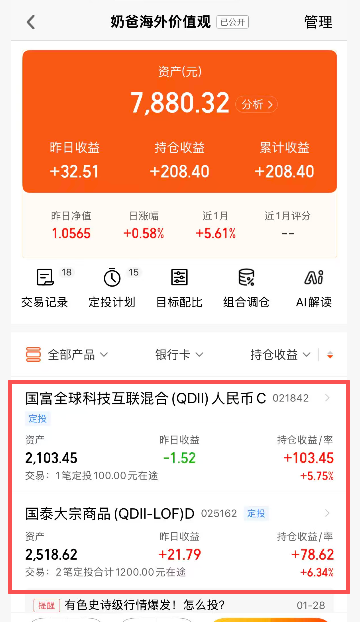 qd额度向来有限,在投资热度越来越上涨的今天,能先上车就先上车,之前跟大家聊我坚持美股和海外黄金定投的逻辑,同样可以落在这只产品身上,今天先加仓1000进入“奶爸海外价值观”,之后走一步看一步,有必要一起加入定投序列。让我们把全世界最优秀的弄潮儿,通过它一网打尽。
