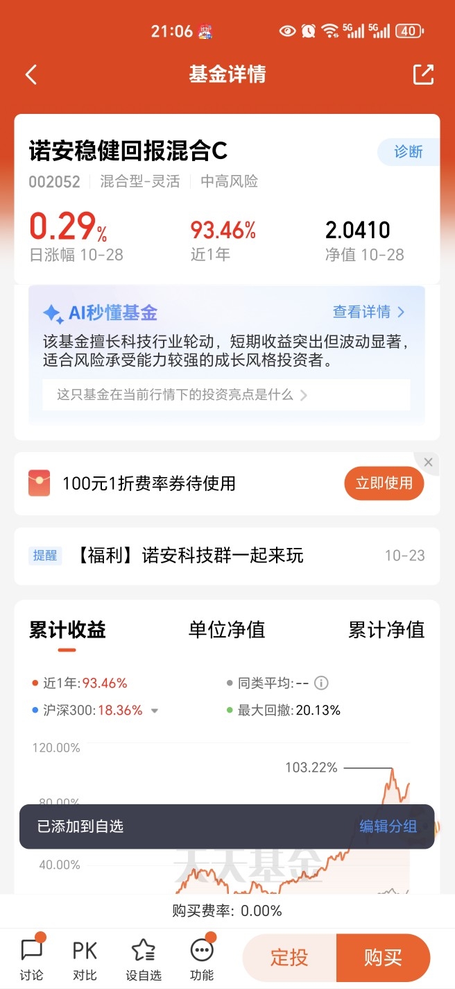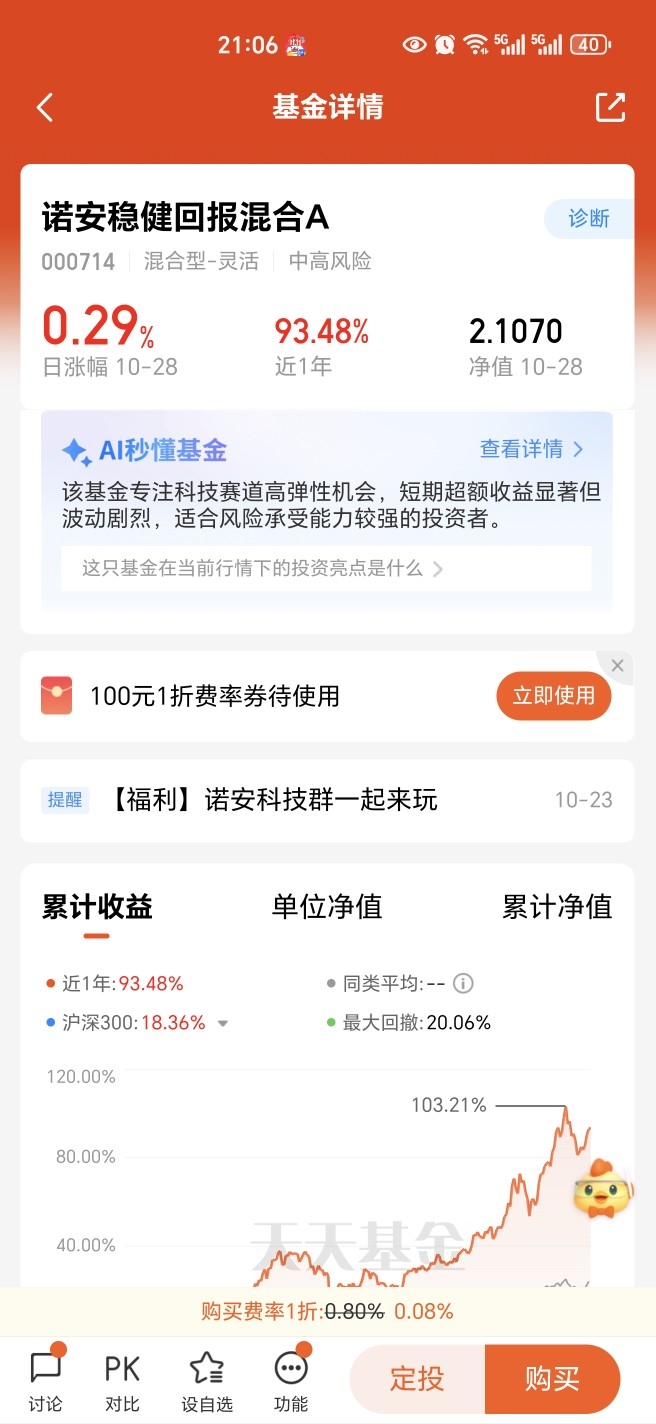 - 业绩表现突出:截至2025年10月28日,该基金近1个月涨幅为1.95%,近3个月涨幅达32.92%,近6个月涨幅为58.37%,近12个月涨幅更是高达93.26%。而同期同类平均涨幅分别为1.79%、14.16%、25.35%、24.48%,诺安稳健回报混合C基金的各阶段涨幅均大幅领先同类平均。