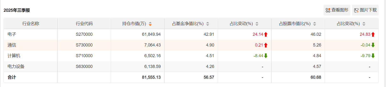 2025年三季度前五大行业占比超56%,其中电子(42.91%)、通讯(4.9%)、计算机(4.51%)为核心,基本是ai产业链。