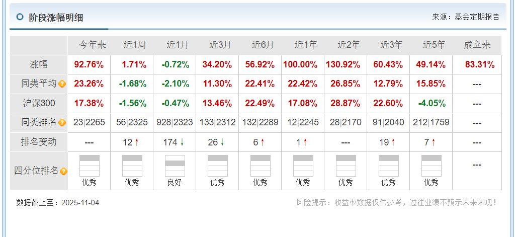 截至2025年11月4日,近一年收益率达100%,远超业绩基准(12.39%);